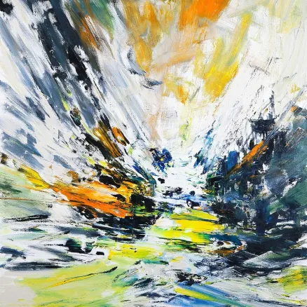 Les ciels en mouvance perpétuelle nous donnent une leçon de vie. Ils se déforment et se reforment sans cesse, toujours en tension vers la perfection. Mouvement permanent de formes et de couleurs empreintes de légèreté ou de lourdeur, de textures épaisses, grasses ou aériennes et de luminosités glacées ou chaudes, ils symbolisent la vie, l’existence du monde …avec ou sans l’homme.